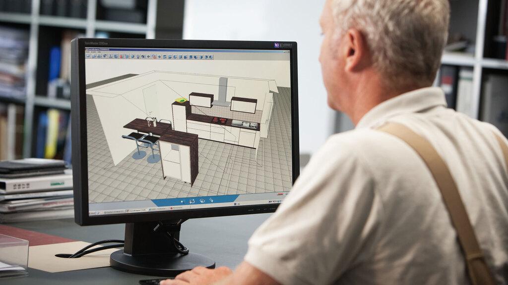 Planungsdarstellung einer Küche in 3D am Computer durch Tischler