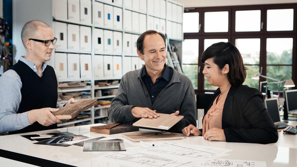 Beratung zu verschiedenen Holzoberflächen zwischen Berater und Eheleuten