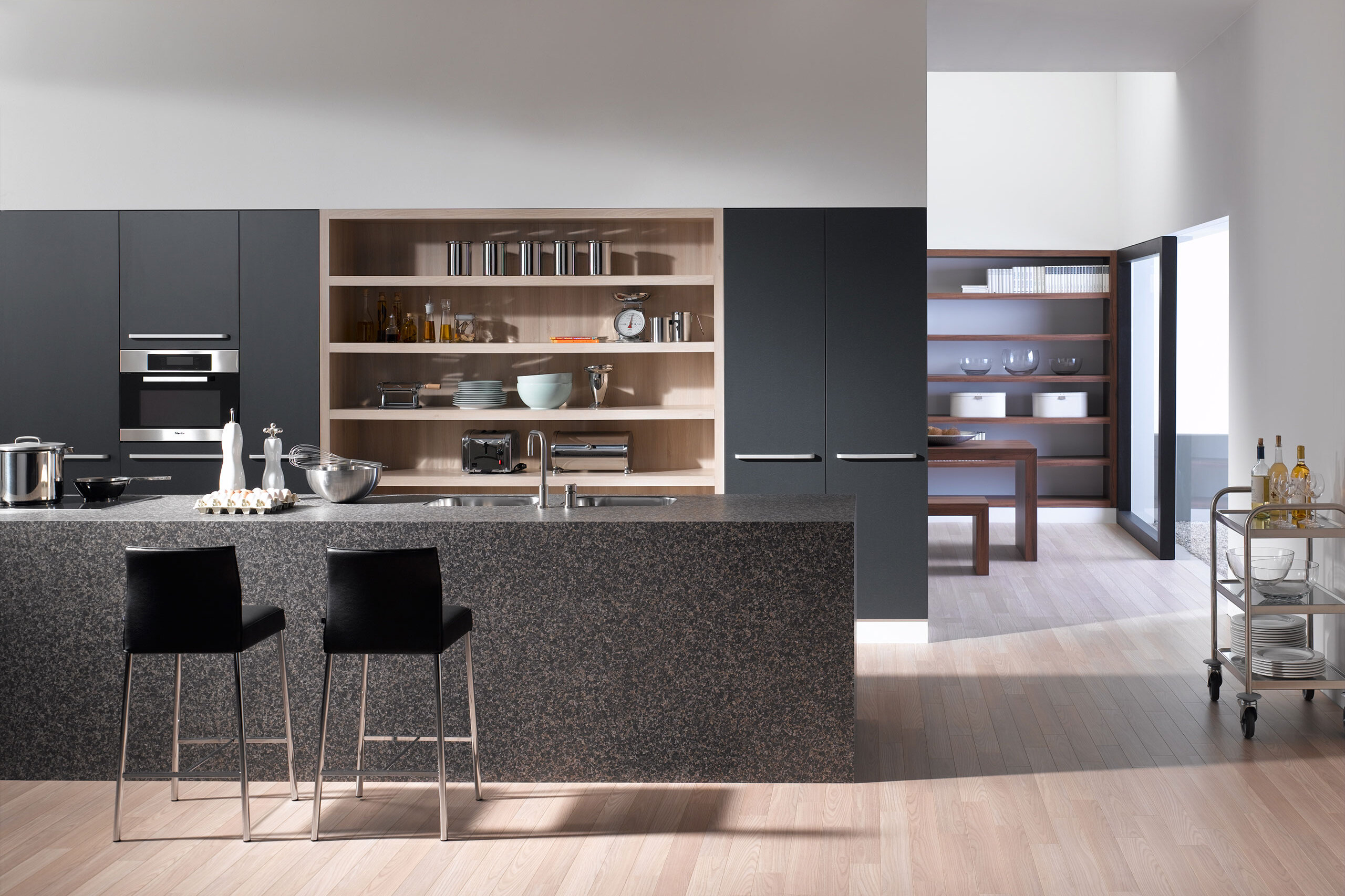 Impression einer offenen Küche mit Küchentheke in dunkler Anthrazit-Lackierung